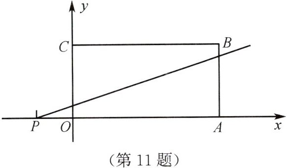 11. 如图,矩形 $OABC$ 在直角坐标系中,$OA = 4$,$OC = 2$,经过点 $P(-1,0)$ 的直线将矩形 $OABC$ 的面积两等分,则此直线的解析式为