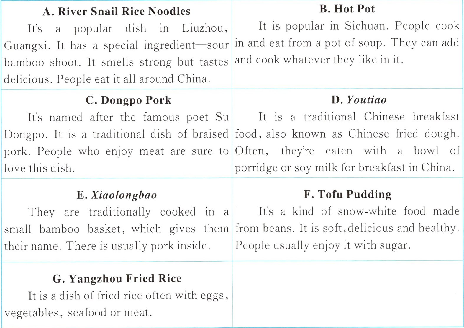 下面是五位外国留学生的饮食喜好,请从方框内为每个学生选择一道合适的中国传统食物。选项中有两项为多余选项。