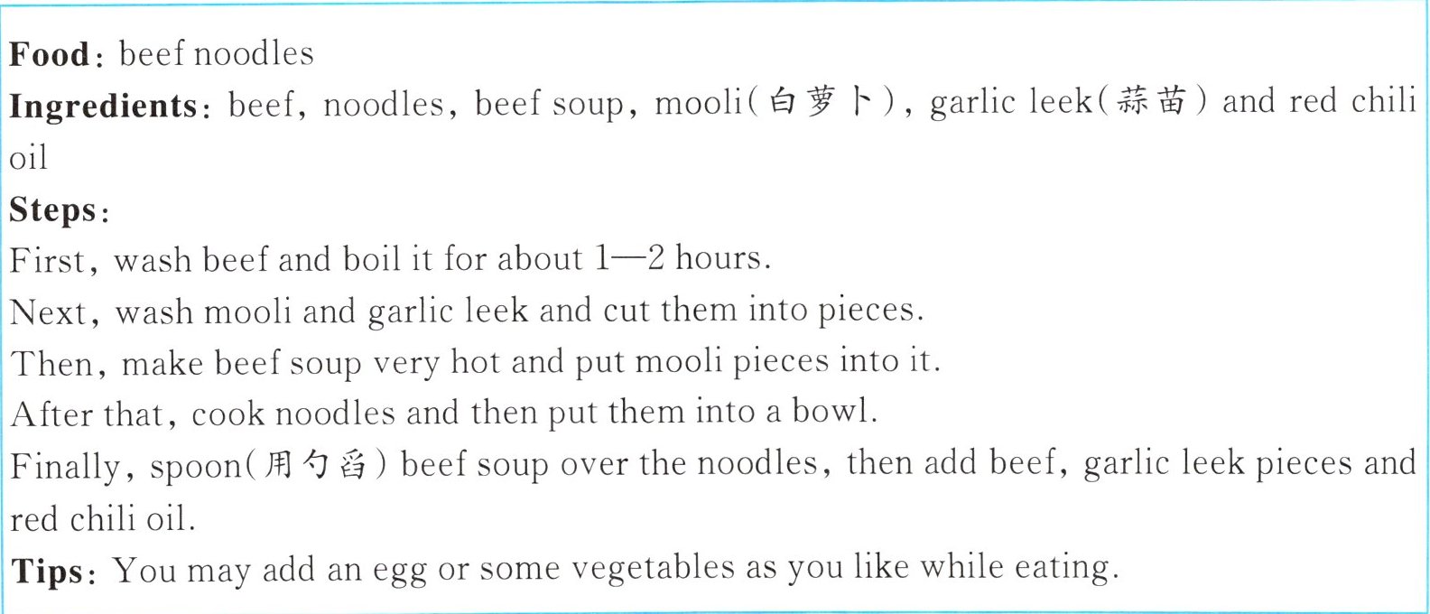 What people eat and how they eat are different from place to place. For example, in Lanzhou, people usually have beef noodles for breakfast while cheese sandwiches are very popular in London. Here are the recipes (烹饪法) of making them. You can have a try if you like!