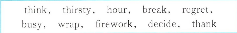 1. thankful 2. decisions 3. fireworks 4. wrapped 5. busier 6. regrets 7. broken 8. hours 9. thirsty 10. thinking
