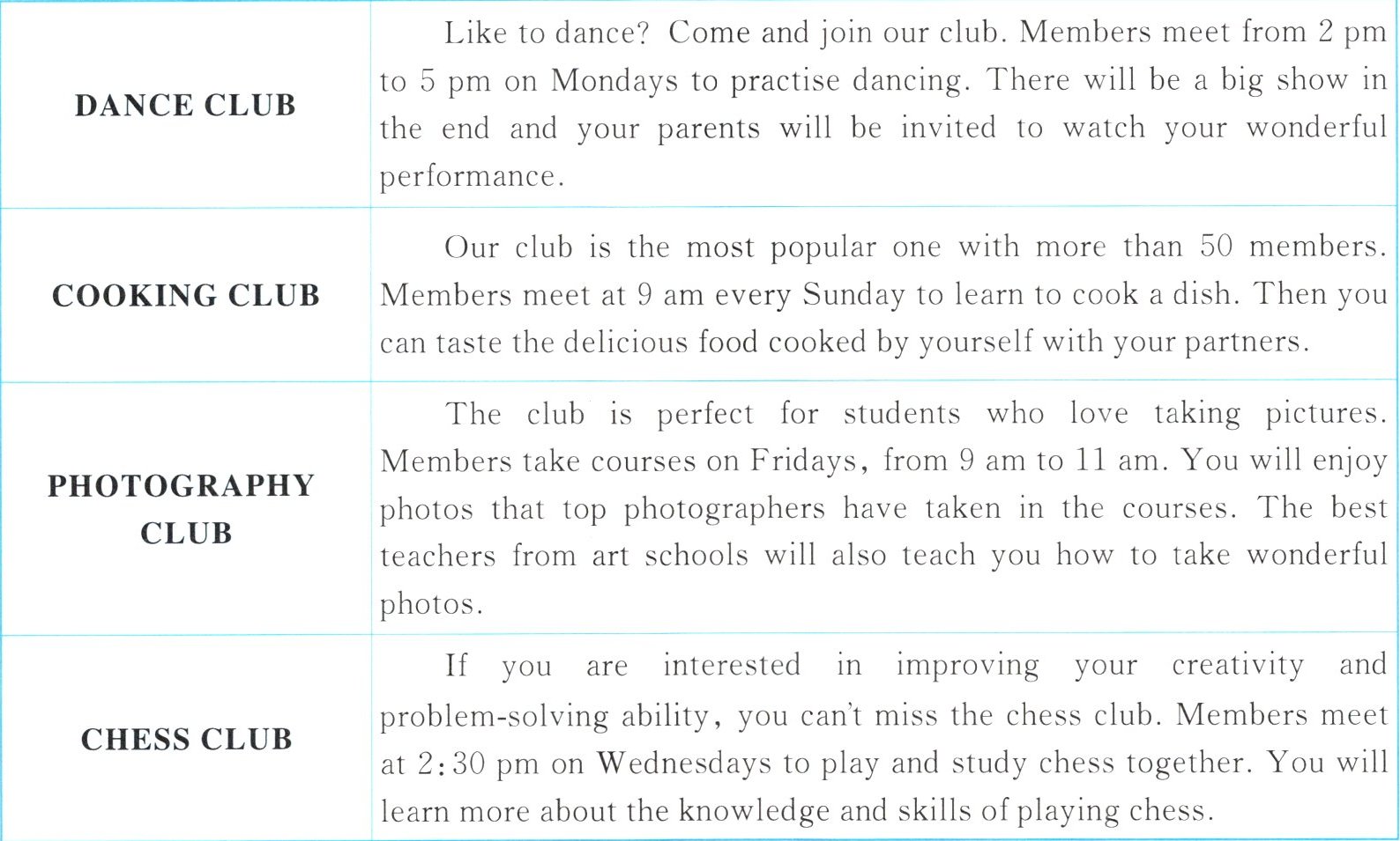 The summer vacation is on the way! Spend time on your computers or on your mobile phones? Stay at home and watch TV? Why don't you join one of the following clubs to develop your new interests and hobbies?