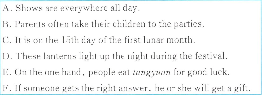 5. ______ People can enjoy many performances such as a dragon lantern dance, a lion dance, a Yangge dance and beating the drums. People always enjoy themselves during the Lantern Festival.