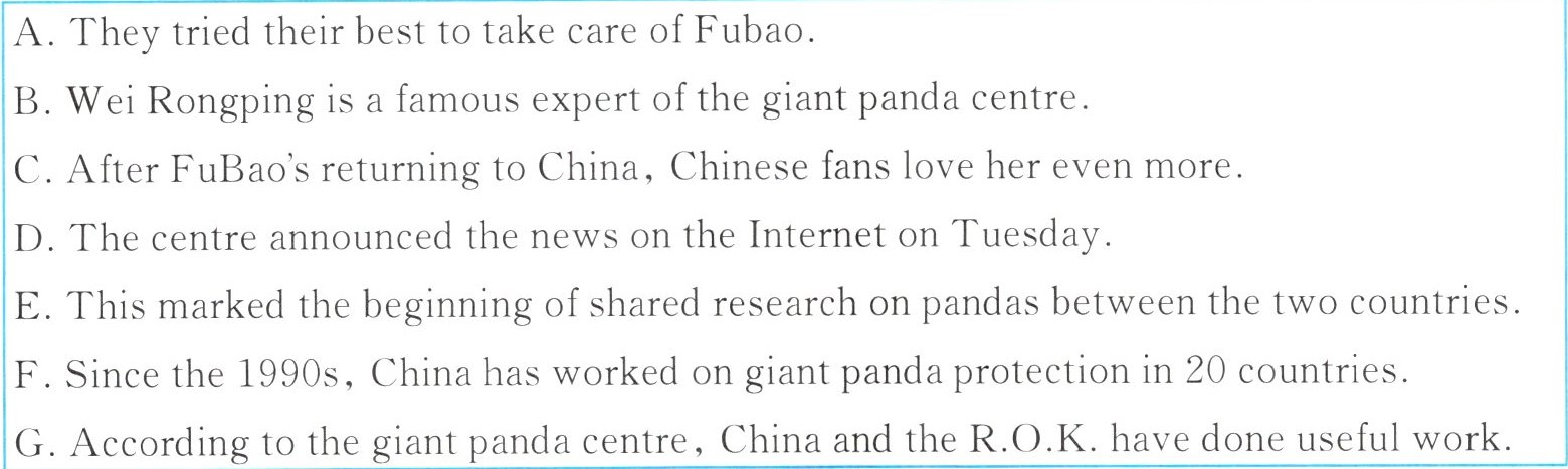 . He said, “When giant pandas return to China, they have to accept a new environment, caregivers and food.” During the isolation(隔离) and quarantine time, a team of experts will help her adapt to her new living environment.Fubao’s parents arrived in the R.O.K. in March, 2016 from the giant panda centre in China. 4.