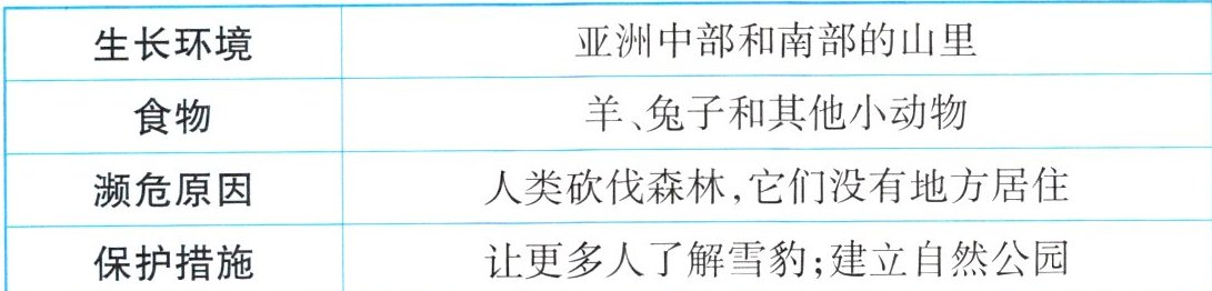 世界上有很多动物濒临灭绝,雪豹就是其中之一。请根据表格中的信息,写一篇英语短文倡导人们保护雪豹。词数:80左右。