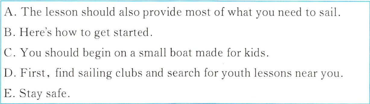 The most important lesson you can learn in sailing is how to do it safely, with the help of experienced sailing coaches. 3. ______ Then ask your parents to call them to find out what lessons or camps they have for kids in your age group.