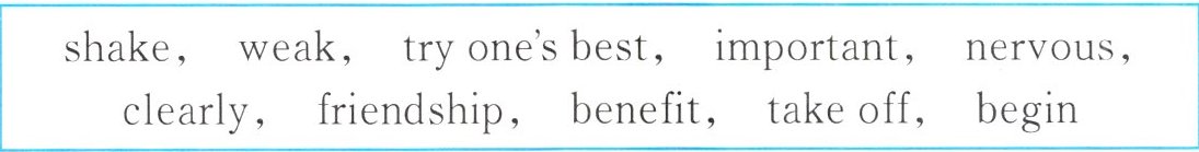 1.took off 2.benefits 3.shook 4.try your best 5.nervously 6.weak 7.important 8.beginning 9.clearly 10.Friendship