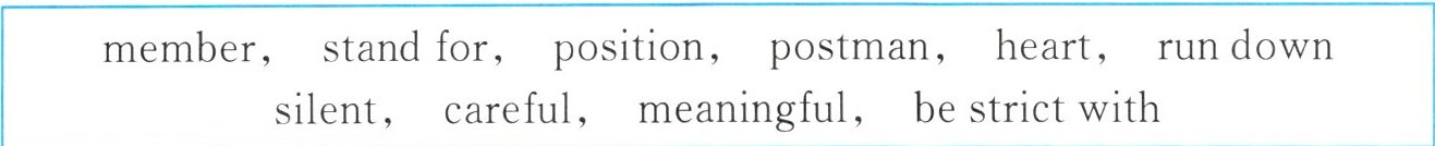 1. be strict with 2. postmen 3. position 4. meaningful 5. members 6. care 7. ran down 8. hearts 9. stands for 10. silently