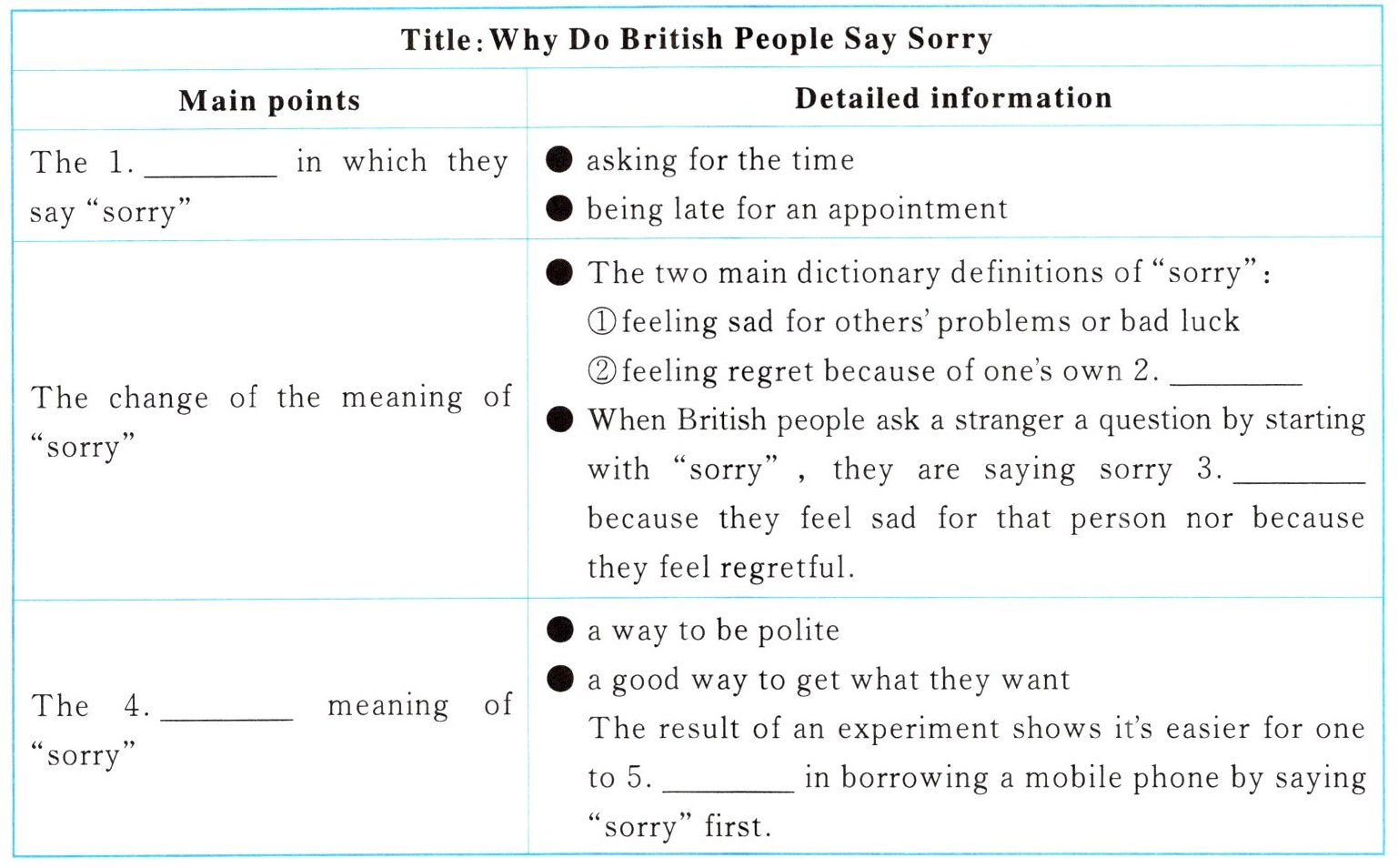 British people pride themselves on their polite manners towards one another in public. They often use the word “sorry”—even when they don't really mean it! Usually, if they want to ask a stranger for the time, they would start by saying “Sorry to bother you. Do you know what time it is?”. If they're five minutes late for an appointment (约会), they would generally greet the person by saying “Sorry, I'm late!”.