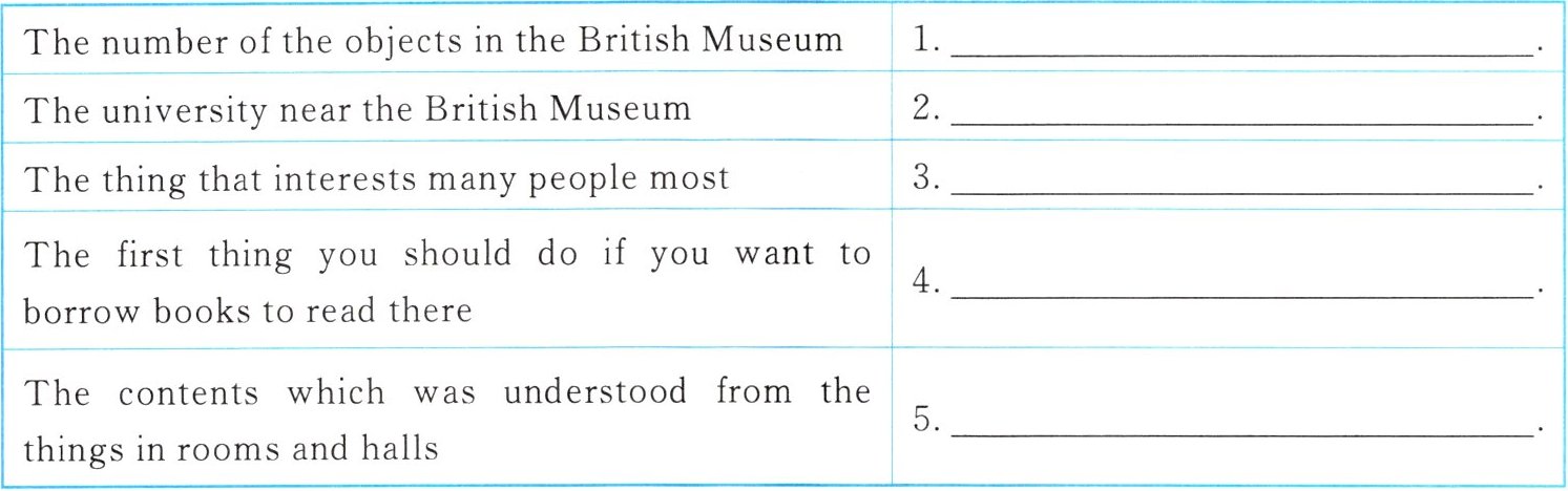 1. More than 13 million 2. London University 3. The large library 4. To get a reader's ticket (from the office) 5. The history of foreign lands and the people who live in them