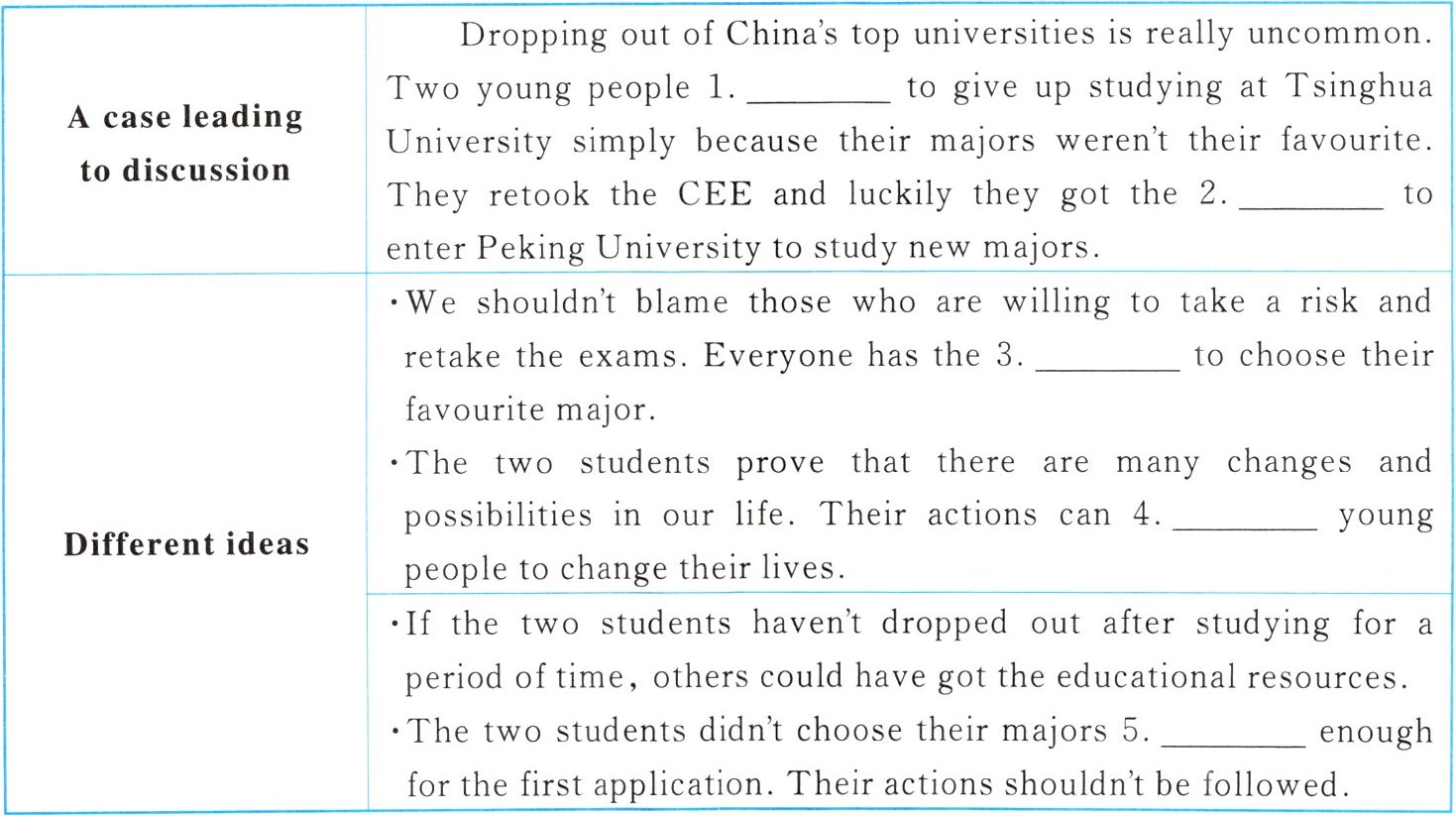 1. We shouldn't blame(责怪) those who are willing to take a risk and take the CEE again. It's OK for everyone to choose their favourite major for a better career in the future.