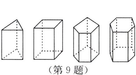 9. 已知三棱柱有 5 个面,6 个顶点,9 条棱;四棱柱有 6 个面,8 个顶点,12 条棱;五棱柱有 7 个面,10 个顶点,15 条棱……由此可以推测,$n$ 棱柱有