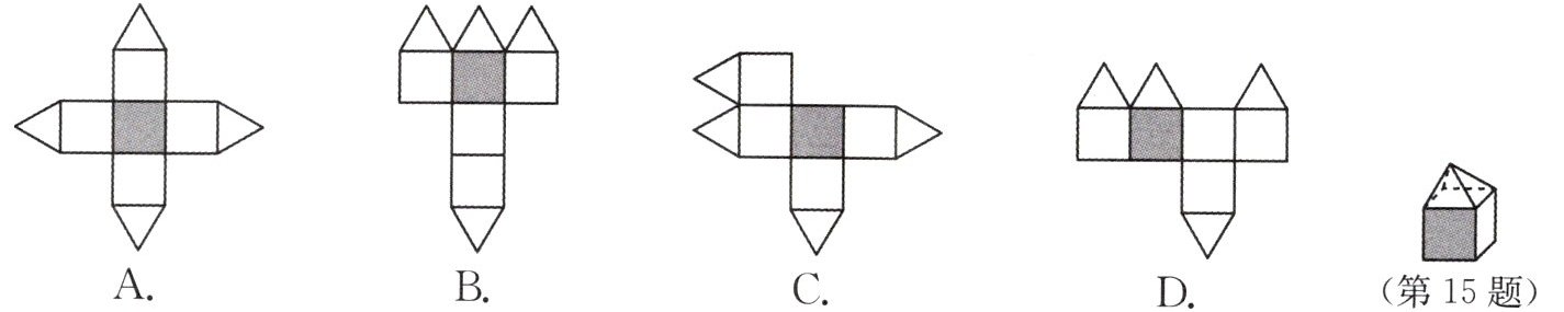15. 【济宁】如图,一个几何体上半部分为正四棱锥,下半部分为立方体,且有一个面涂有颜色,该几何体的表面展开图是(