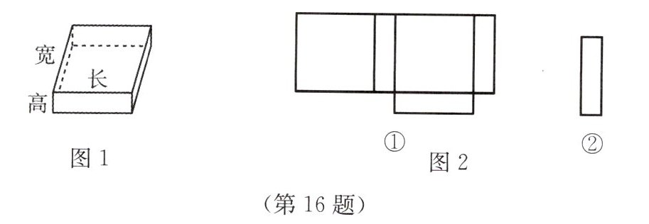 16. 小明了解到很多几何体都能展开成平面图形,于是他在家用剪刀展开了一个长方体纸盒(如图1),可是一不小心多剪了一条棱,把纸盒剪成了两部分,即图2中的①和②。根据你所学的知识,回答下列问题: