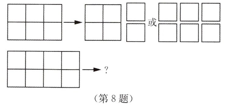 8. 如图,一个$3×2$的长方形可以用2种不同的方式分割成3或6个小正方形,那么一个$4×2$的长方形用不同的方式分割后,小正方形的个数可以是