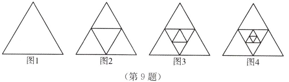 9. 图1是一个三角形,现分别连结这个三角形三边的中点将这个三角形分割成4个较小的三角形(即分割成四部分)得到图2,再连结中心这个三角形三边的中点继续将它分割得到图3;再继续连结最中心三角形三边的中点将它分割得到图4.图3中大三角形被分割成______个三角形;图4中大三角形被分割成______个三角形.按上面的方法继续分割下去,第n个图形被分割成______个三角形(用含n的代数式表示).