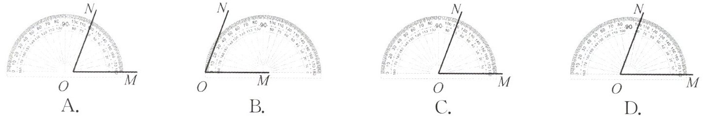 13. 【河北】用量角器测量$\angle MON$的度数,下列操作中正确的是(