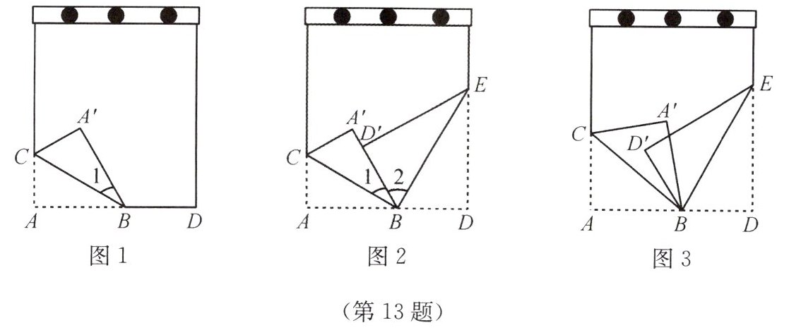 13. 如图1,将笔记本活页的一角折过去,使角的顶点$A落在点A'$处,$BC$为折痕。