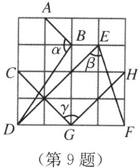 9. 如图为一个$4× 4$的正方形网格,记$\angle ABD = \alpha$,$\angle DEF = \beta$,$\angle CGH = \gamma$,则(