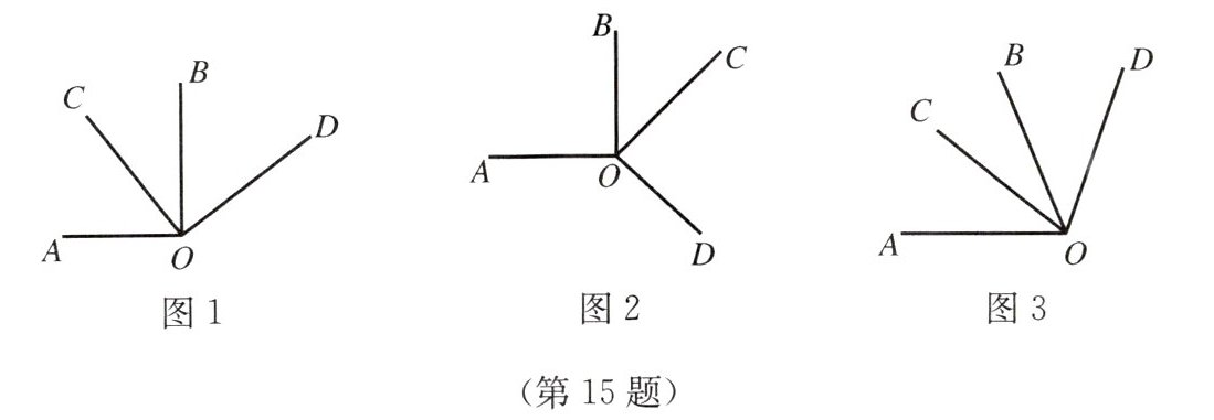 15. (1)如图 1,$\angle AOB$ 和$\angle COD$ 都是直角,请你指出$\angle AOD$ 和$\angle BOC$ 之间的数量关系,并说明理由。