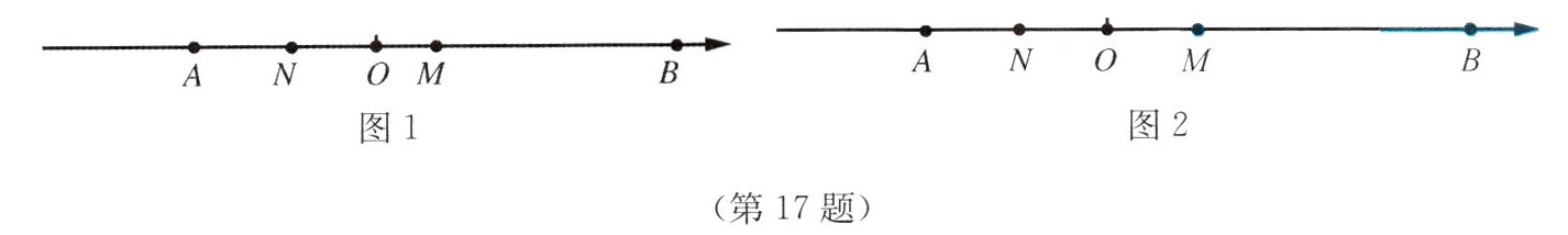 17. 已知 $A$,$B$ 两点在数轴上表示的数分别为 $a$ 和 $b$,$M$,$N$ 均为数轴上的点,$O$ 为原点,且 $OA < OB$。