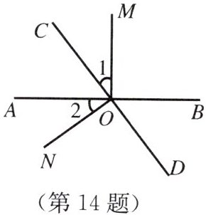 14. 如图,直线$AB$,$CD相交于点O$,过点$O作两条射线OM$,$ON$,且$\angle AOM= \angle CON= 90^{\circ}$.