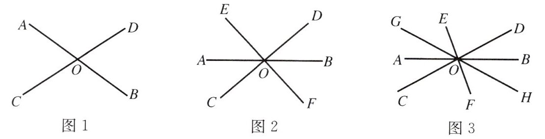 对对顶角.(4)研究(1)~(3)中直线条数与对顶角的对数之间的关系,若有$n$条直线相交于一点,则可形成