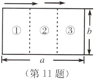 11. 如图所示为一个长方形的铝合金窗框,其长为$a$,宽为$b$,装有同样大的$3$块塑钢玻璃,当第②块向右拉到与第③块重叠$\frac{1}{2}$,再把第①块向右拉到与第②块重叠$\frac{1}{3}$时,用含$a$,$b$的式子表示这时窗子的通风面积是(