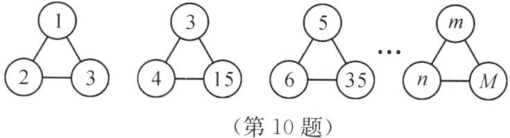 10. 如图,各图形中的三个数之间均具有相同的规律. 根据此规律,图形中$M与m$,$n$的关系是(