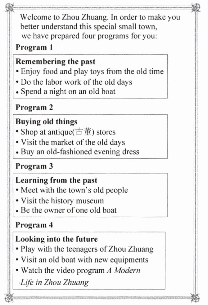 Welcome to Zhou Zhuang. In order to make you better understand this special small town, we have prepared four programs for you: