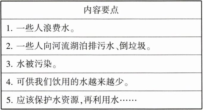 They waste a lot of water, pour dirty water and throw rubbish into rivers or lakes. As a result, many rivers and lakes are polluted, and there is less and less clean water for us to drink. So we must do something to protect the water resources. We should stop the pollution and find ways to reuse water. If everyone can do so, we are sure to have enough and clean water.