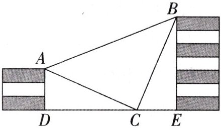 5. 用10块高度相同的长方体小木块垒了两堵与地面垂直的木墙AD,BE,AD= 9 cm,BE= 21 cm,两木墙之间刚好可以放进一个等腰直角三角板(AC= BC,∠ACB= 90°),点C在DE上,点A,B分别与木墙的顶端重合,求两堵木墙之间的距离.