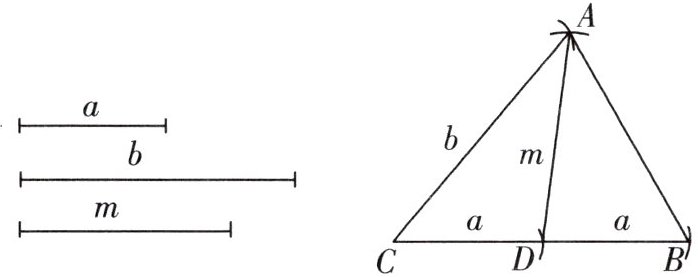 8. 已知线段a,b和m,求作:△ABC,使BC= 2a,AC= b,BC边上的中线AD= m。莹莹想出了一种作法,根据图中她的作图痕迹,你能想出她是怎样作出来的吗?