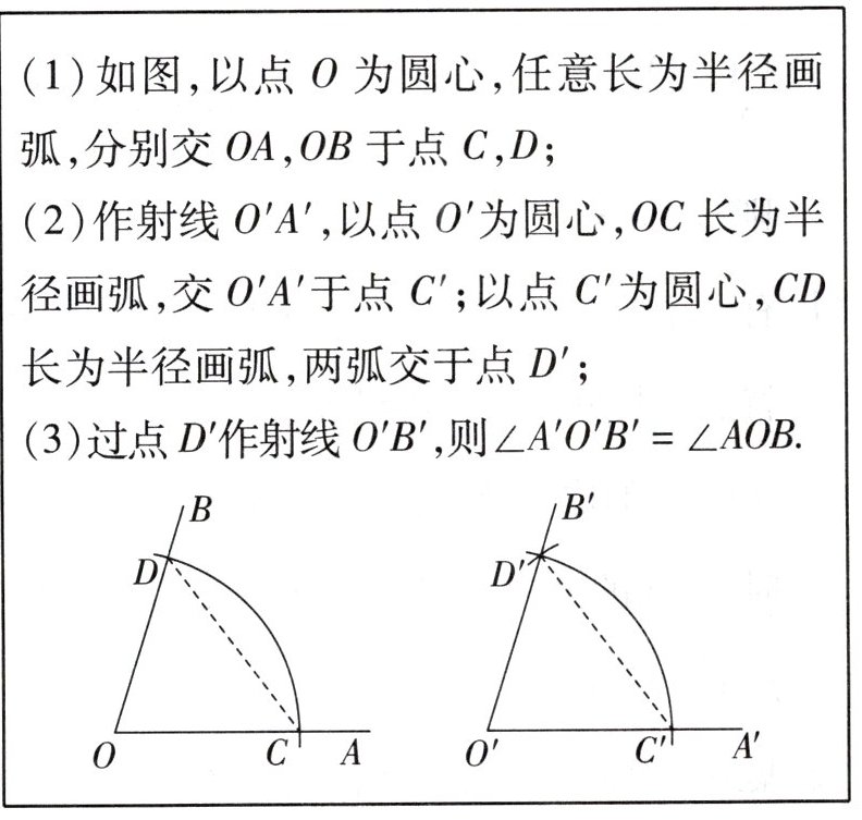 例3. 下面是“作一个角使其等于$\angle AOB$”的尺规作图方法。