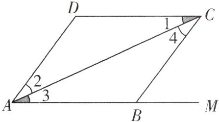 D.$ ∵ ∠DAM = ∠CBM $,$ ∴ AD // BC $(两直线平行,同位角相等)