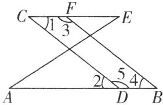 ①∠2 内错角相等,两直线平行;②∠3 同旁内角互补,两直线平行;③CD FB 同位角相等,两直线平行