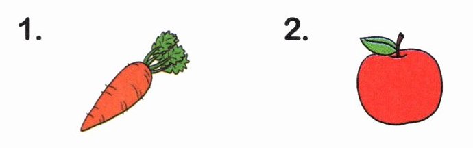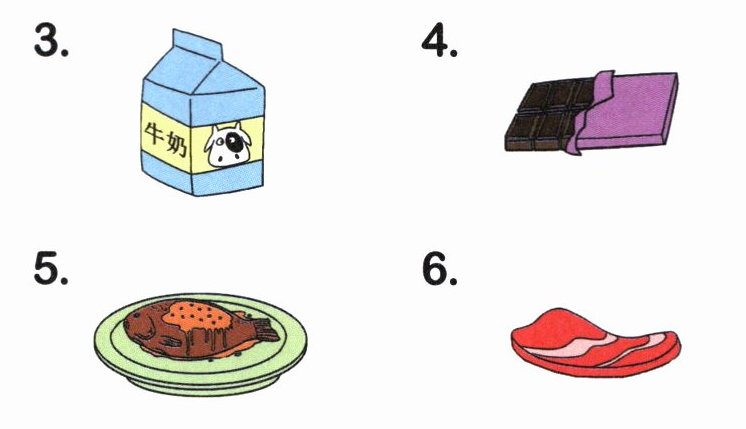 1. carrot 2. apple 3. milk 4. chocolate 5. fish 6. meat