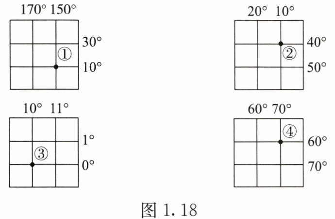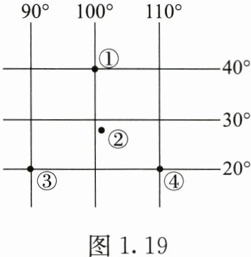 党的二十大报告指出,我国一些关键核心技术实现突破,载人航天、探月探火等取得重大成果,进入创新型国家行列。北京时间 2023 年 10 月 26 日 11 时 14 分,我国“神舟十七号”载人飞船在甘肃酒泉卫星发射中心发射成功。酒泉卫星发射中心的位置大致为 $(40^{\circ}N,100^{\circ}E)$。读经纬网局部图(图 1.19),完成 3~4 题。