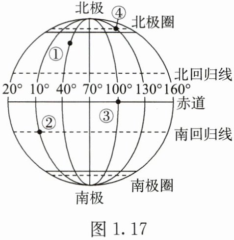 D【解析】①地的经纬度为(10°N,150°W),A 错误;②地位于 20°W 以东,160°E 以西,属于东半球,B 错误;③地位于②地的东北方向,C 错误;④地的纬度为 60°S,位于南半球,D 正确。故选 D。