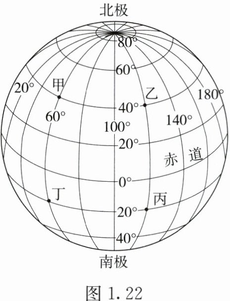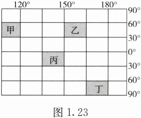 4. 读经纬网图(图 1.23),图中四个阴影区域的实际面积(