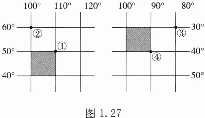 图1.27为两幅经纬网图。读图,完成7~8题。