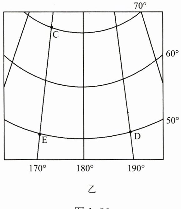 半球;乙图中E点位于东、西半球中的西