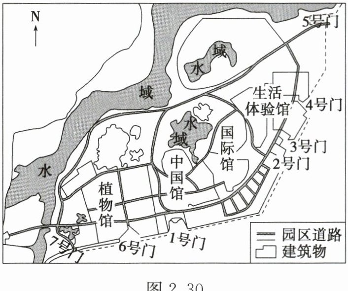 暑假,小明计划从四川省乐山市前往北京市游览北京世园公园,需要提前做好旅游攻略。图 2.30 为北京世园公园导览图。据此完成 4~6 题。