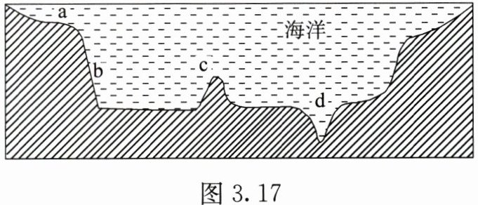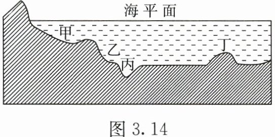 4. 图 3.14 为某海域海底地形示意图,甲、乙、丙、丁四处地形类型依次是(