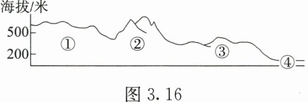 1. 图 3.16 中①②③④四处的地形类型依次是(