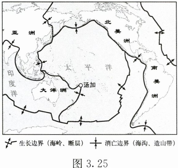 2022年1月15日,岛国汤加发生大规模火山喷发并引发多种灾害,给当地居民生产生活带来了较大的影响。读图3.25,完成4~5题。