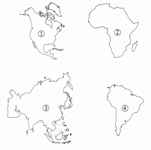 A【解析】图①至图④分别为北美洲、非洲、亚洲和南美洲,魏格纳发现非洲和南美洲两个大洲的大陆轮廓可以“吻合”,②④符合题意。故选A。