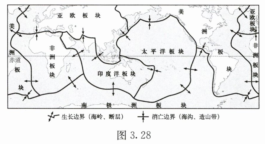 板块构造学说认为,板块张裂拉伸的地方为生长边界,碰撞挤压的地方为消亡边界。读世界板块分布图(图3.28),完成7~8题。