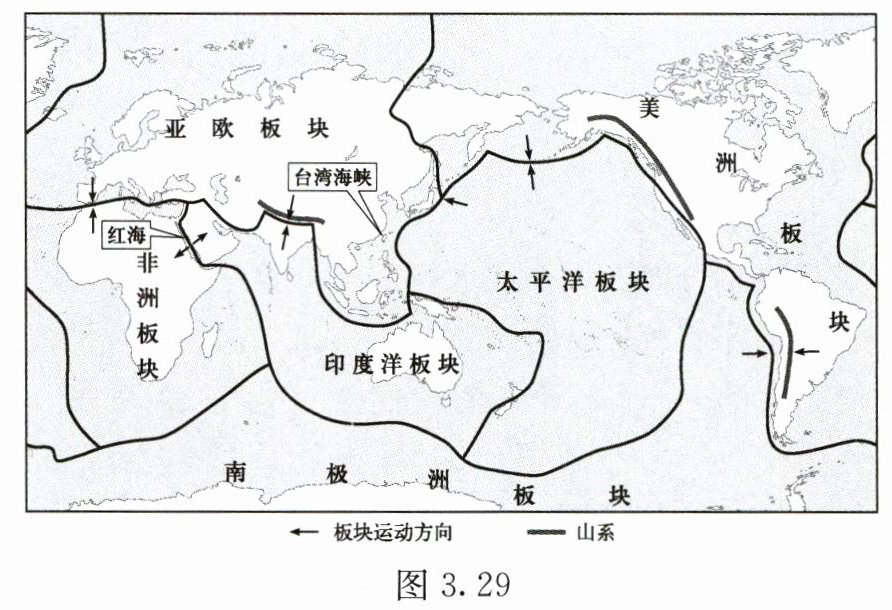 (1)挤压(2)太平洋 亚欧 环太平洋 地中海—喜马拉雅(3)非洲 红海位于非洲板块和印度洋板块交界处,发生张裂运动,面积不断扩大。