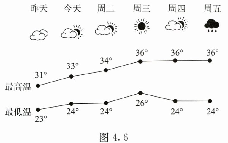 6. 如图4.6是小美在手机上看到的天气预报图,周三天气(