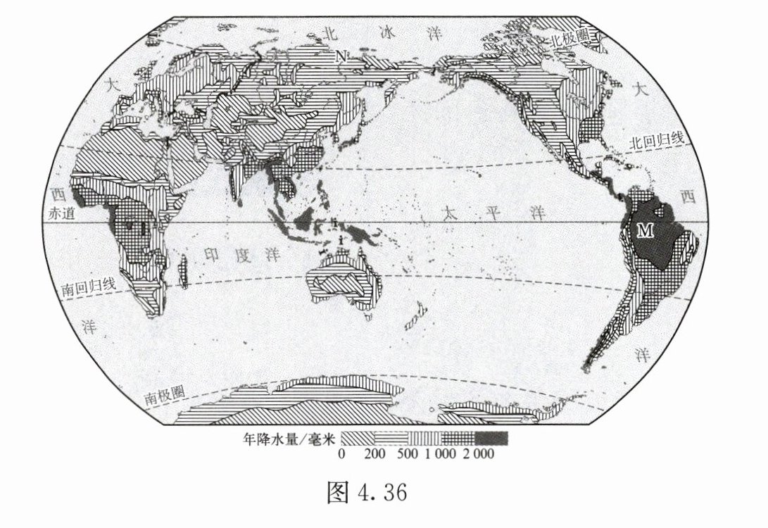 读世界年降水量分布图(图 4.36),完成 $5~6$ 题。